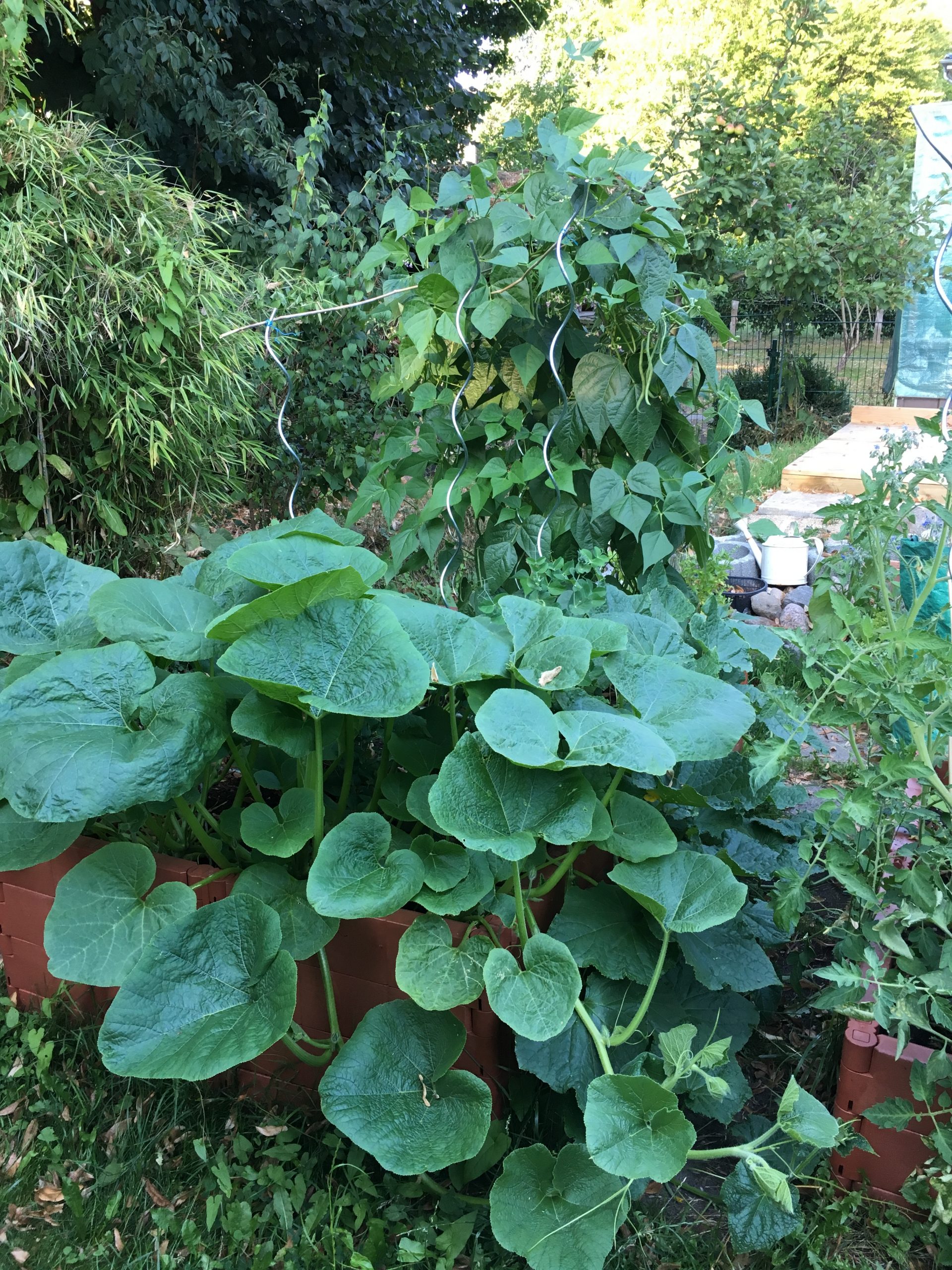 Kürbis-Wucherung, im Hintergrund Bohnen.